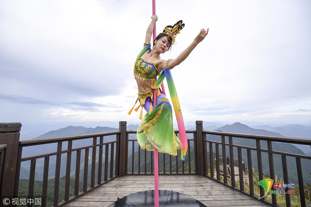 2018年9月20日,中秋節(jié)前夕,位于長(zhǎng)三角第一高峰海拔1929米的浙江龍泉山頂,一場(chǎng)柔美的鋼管舞表演吸引了眾人圍觀(guān)。