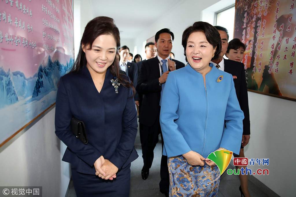當(dāng)?shù)貢r(shí)間2018年9月18日,朝鮮平壤,韓國總統(tǒng)文在寅夫人金正淑在朝鮮國務(wù)委員會(huì)委員長金正恩夫人李雪主的陪同下參觀平壤金元均音樂大學(xué)。圖片作者:視覺中國