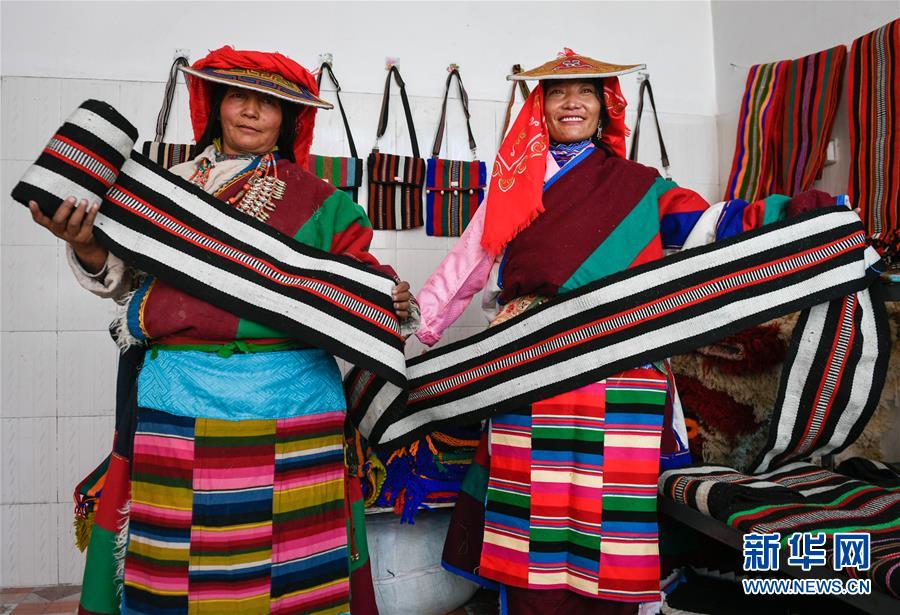 員工益西措姆(左)與嘎措在鹽湖鄉(xiāng)羌麥村民族手工編織廠展示產品(9月19日攝)。 2018年,西藏阿里地區(qū)革吉縣鹽湖鄉(xiāng)政府自籌資金成立羌麥村民族手工編織廠,編織廠將當地傳統(tǒng)手工編織技藝與市場需求相結合,生產手提包、圍脖、腰帶、毛毯、藏式頭巾等產品,并參加旅游推介活動,拓寬編織品銷售渠道,助力當地居民脫貧。 新華社記者 劉東君 攝