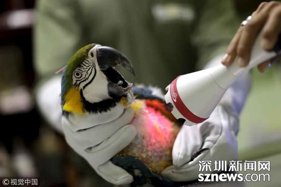 當?shù)貢r間2015年7月30日,巴西巴西利亞,一只藍喉金剛鸚鵡正在接受激光治療。