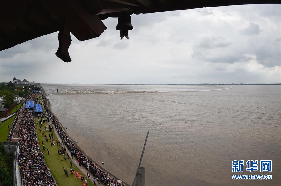 9月27日在浙江海寧市鹽官鎮(zhèn)占鰲塔上拍攝的錢塘江“一線潮”。當(dāng)日是農(nóng)歷八月十八,號(hào)稱“天下第一潮”的錢塘江大潮洶涌而來,眾多錢塘江沿岸居民和游客爭(zhēng)睹其壯觀景象。新華社記者 黃宗治 攝