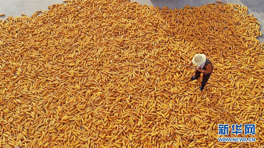 9月23日,河北省灤縣茨榆坨鎮(zhèn)西長坨村農(nóng)民在晾曬玉米(無人機(jī)拍攝)。
