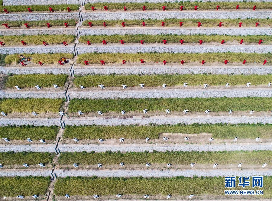 9月29日拍攝的秋日中的建德市大洋鎮(zhèn)高垣村梯田風(fēng)景。當(dāng)日,2000多名太極拳愛好者在浙江省建德市大洋鎮(zhèn)高垣村的千畝梯田上參加太極拳表演,吸引很多當(dāng)?shù)厝撕陀慰颓皝碛^賞,助力當(dāng)?shù)亟鹎飼r(shí)節(jié)鄉(xiāng)村旅游。近兩年來,大洋鎮(zhèn)充分利用土地整治后形成的千畝梯田打造農(nóng)業(yè)觀光綜合體,發(fā)展綜合型農(nóng)業(yè)觀光旅游,為鄉(xiāng)村振興注入新活力。新華社記者徐昱攝