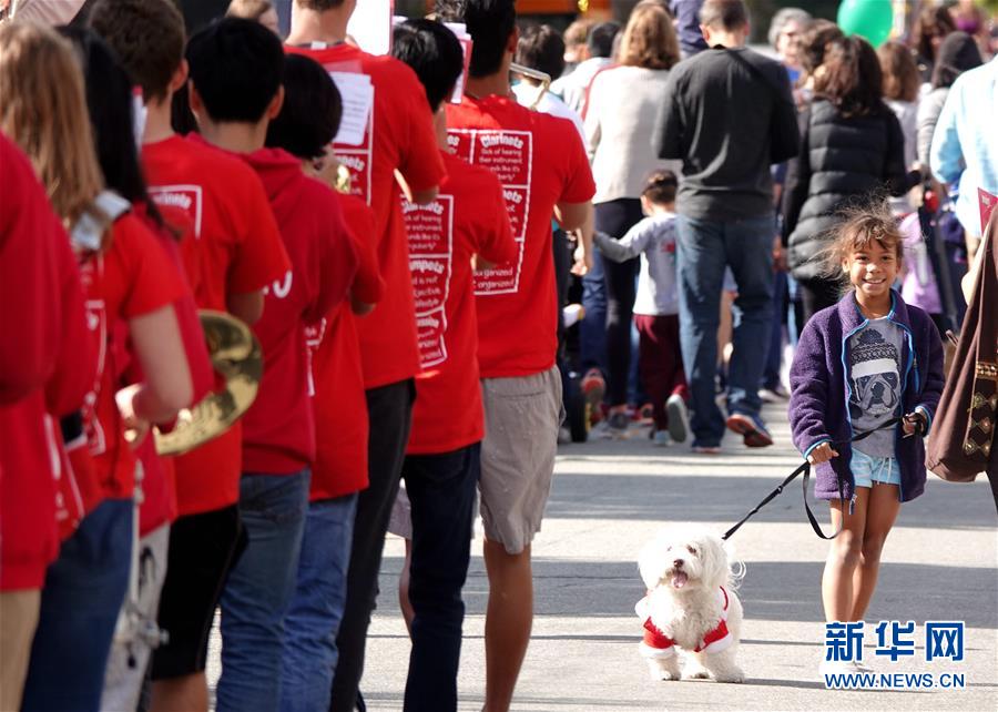 9月29日,在美國(guó)加利福尼亞州伯林蓋姆市,一支學(xué)生樂(lè)隊(duì)參加寵物狗大游行活動(dòng)。美國(guó)加州舊金山灣區(qū)的伯林蓋姆市29日舉行寵物狗大游行活動(dòng)。新華社記者吳曉凌攝