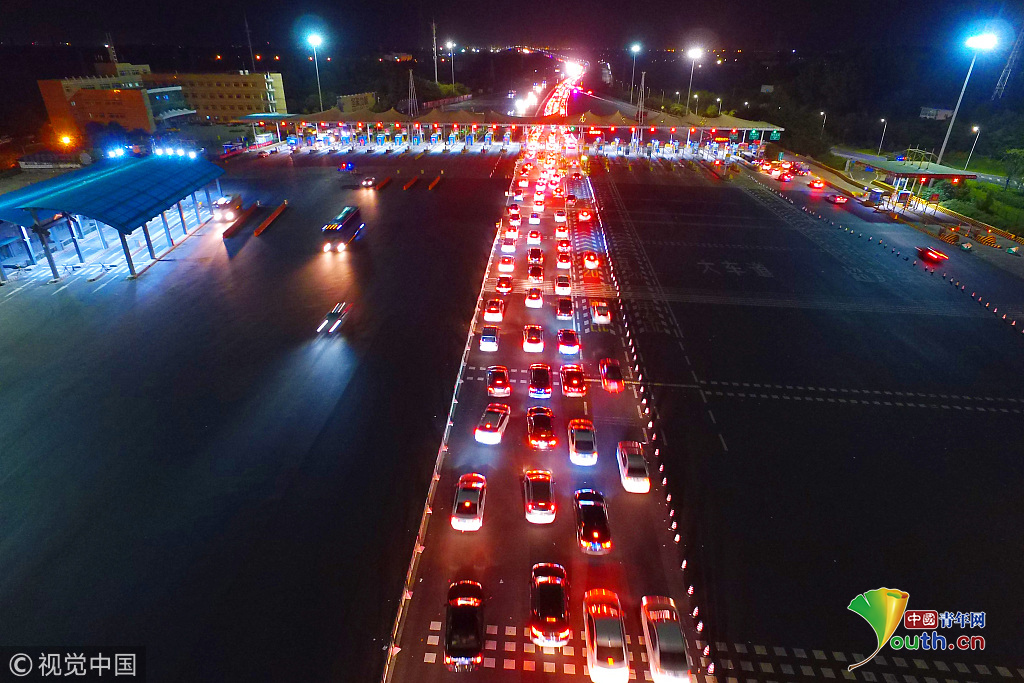 2018年10月1日,國慶假期首日凌晨1點左右,南京迎來出行高峰,所有高速公路出城方向迎來大批車輛,航拍南京長江二橋收費站,大量車輛排起長龍,場面尤為壯觀。圖片作者:方東旭