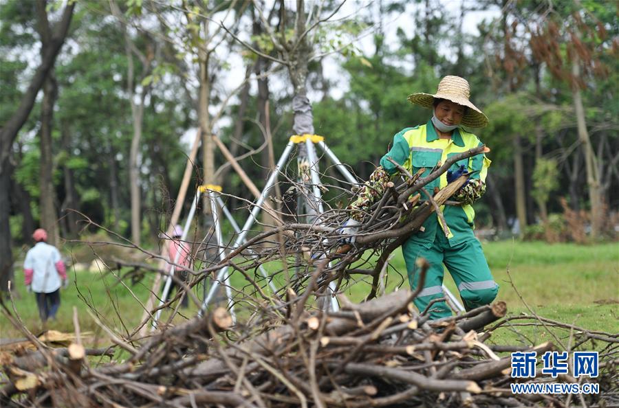 10月1日,工作人員在深圳街頭的綠化帶清理強臺風“山竹”損毀的樹木。當日是國慶節(jié),許多勞動者堅守在工作一線,在崗位上度過節(jié)日。新華社記者毛思倩攝