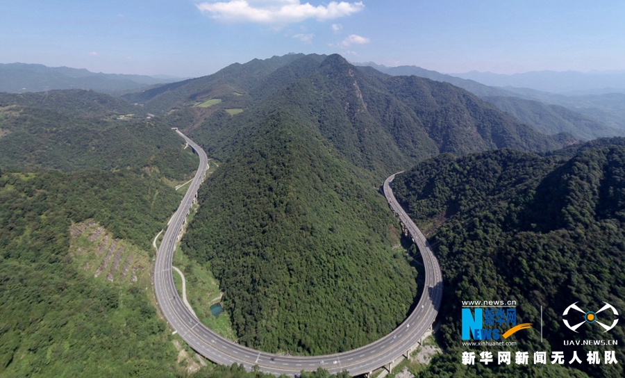 拼接照片:這是廈蓉高速長下坡龍巖路段的道路景觀,高速在群山中穿行。改擴建工程竣工之后,長下坡將改成上行線,變?yōu)樯掀侣范危o人機拍攝)。新華網 肖和勇 攝