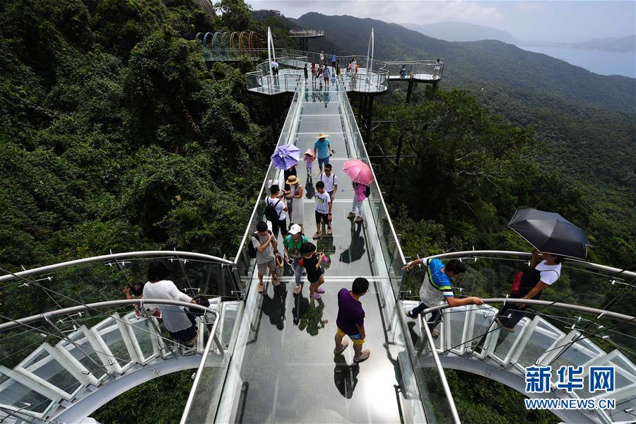 8月31日,游客在玻璃棧道上參觀游覽。近日,位于海南省三亞市亞龍灣熱帶天堂森林公園的大佛石全海景玻璃棧道開(kāi)始正式營(yíng)業(yè)。凌空而建的玻璃棧道全長(zhǎng)400米,游客可將亞龍灣的美景盡收眼底。新華社記者郭程攝