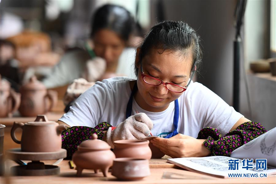 10月9日,欽州市一家廣西坭興陶生產(chǎn)企業(yè)的員工在制作坭興陶產(chǎn)品。 新華社記者 陸波岸 攝