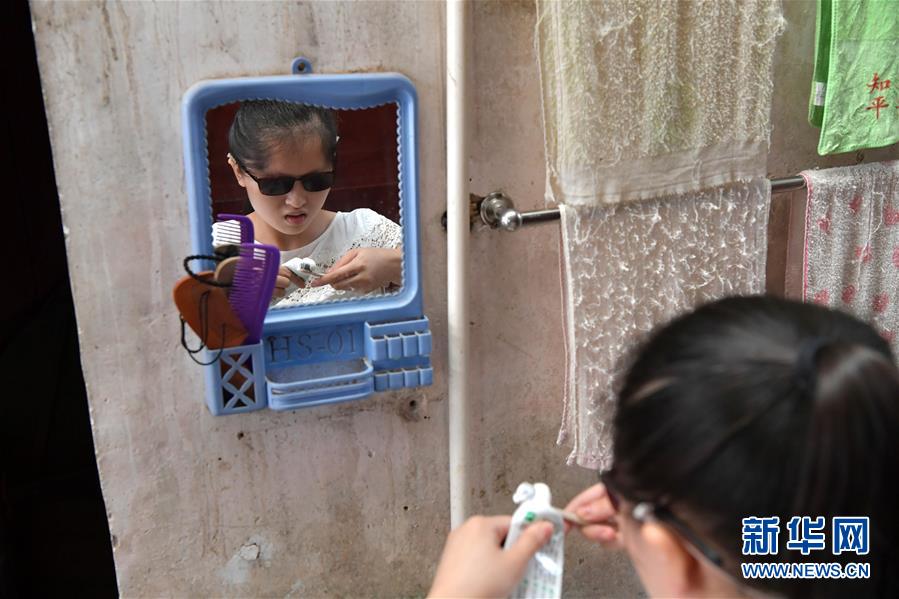 楊虹去按摩院工作前在家中洗漱(9月26日攝)。新華社記者 彭昭之 攝