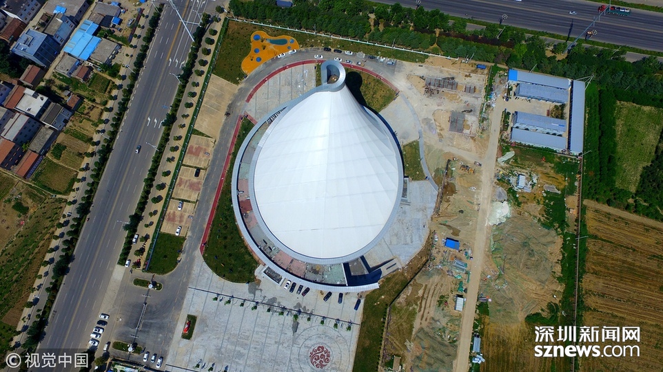2018年6月13日,航拍河南淮陽一座即將竣工落成的體育場(chǎng)館建筑,市民稱酷似一個(gè)石磨盤。