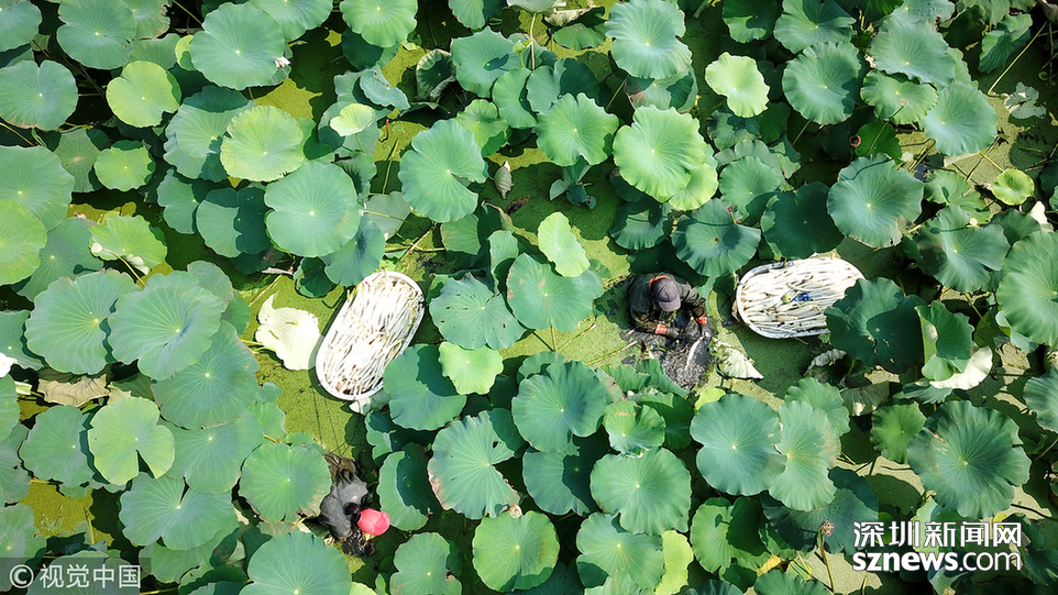 2018年7月25日,江蘇淮安,種植戶在挖藕帶。