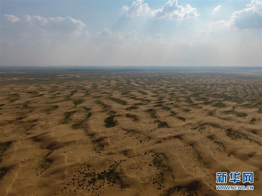 庫(kù)布其沙漠深處,植被與沙漠形成美麗的紋理(7月31日無(wú)人機(jī)拍攝)。新華社記者劉磊攝