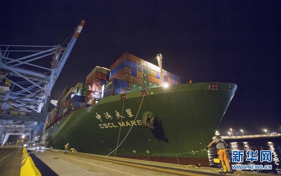 10月15日晚,中遠海運旗下的“中?;鹦恰碧柤b箱輪??吭诒壤麜r澤布呂赫港集裝箱碼頭。 新華社記者 葉平凡 攝