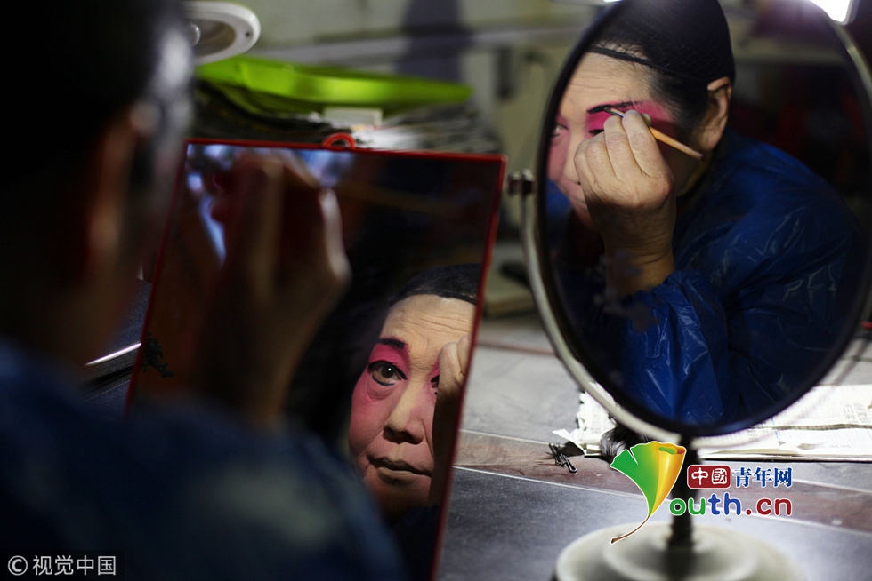 2016年3月10日,陜西安康,今年70歲的劉鳳鳴10歲時開始學(xué)漢調(diào)二黃,40歲時從廁所抱回智殘體殘棄嬰,因為對藝術(shù)的熱愛、對生命的敬畏她選擇了不離不棄。人生如戲,戲如人生。劉鳳鳴說,像她們這樣的業(yè)余劇團,沒有專門的化妝師,她要求每個演員必須學(xué)會化妝。圖片作者:魏永賢/視覺中國