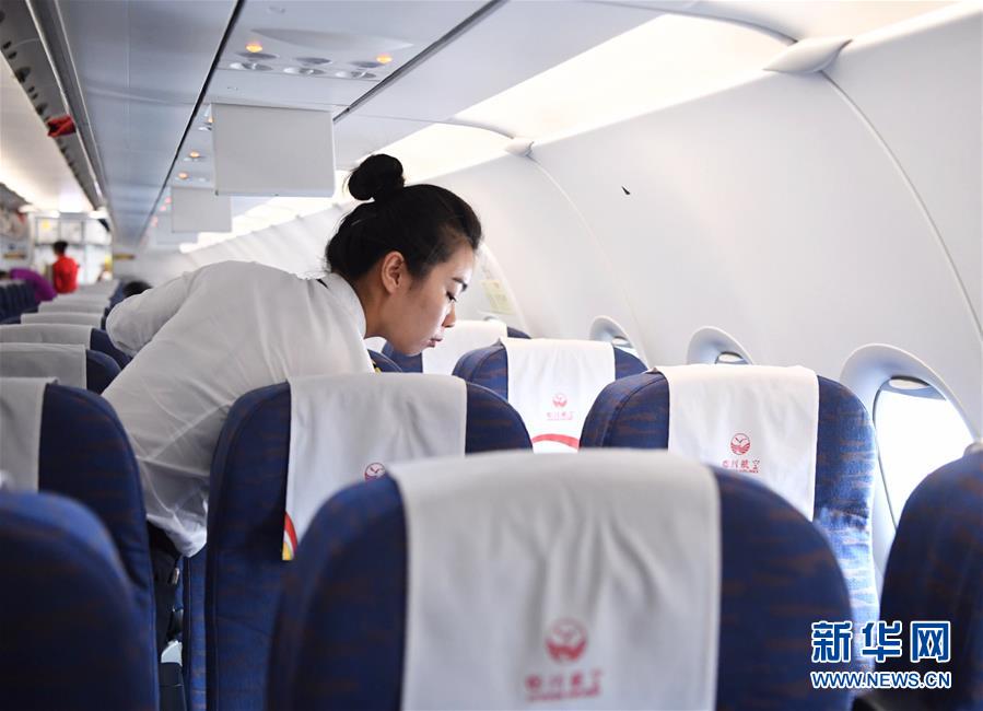 10月16日,湯春燕對飛機(jī)客艙進(jìn)行安保檢查。 新華社記者王全超攝