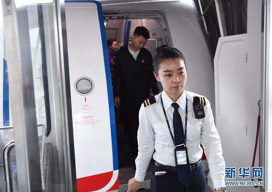 10月16日,航班抵達(dá)重慶江北國際機場后,湯春燕第一個走出艙門,準(zhǔn)備迎接旅客下機。 新華社記者王全超攝