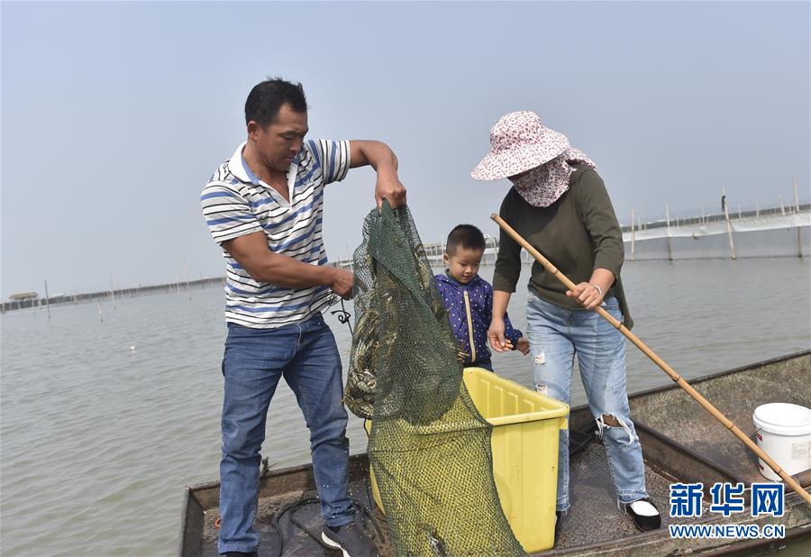 10月17日,湖州廟港人水產(chǎn)有限公司蟹農(nóng)在太湖養(yǎng)殖基地捕撈大閘蟹。 時(shí)值重陽(yáng),太湖南岸的大閘蟹開始大批量上市,迎來豐收季。浙江省湖州市近年來結(jié)合太湖水治理,提升太湖漁業(yè)資源質(zhì)量。目前,湖州太湖蟹養(yǎng)殖面積3.6萬(wàn)畝左右,年產(chǎn)3000多噸。 新華社記者錢一攝