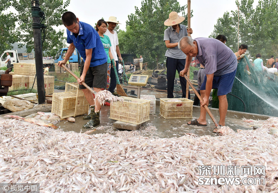 2018年8月16日,安徽巢湖漁民正在裝運(yùn)捕撈上來的毛魚和銀魚。 初秋時節(jié),正值安徽省巢湖水域毛魚和銀魚大量上市季節(jié),從8月15日下午4時起,巢湖迎來一年中最大的秋季魚汛,沿湖1600多戶漁民開始下湖捕撈作業(yè)。