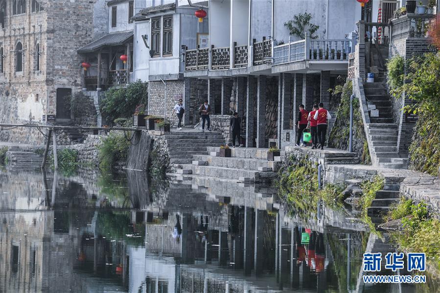 10月17日,河橋鎮(zhèn)的青年黨員們?cè)阪?zhèn)邊的昌南溪邊巡查,并清理兩岸的廢棄物。新華社記者 徐昱 攝