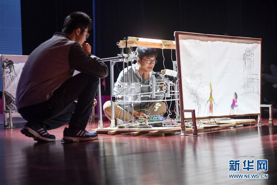 10月21日,在位于安徽合肥的中國科學(xué)技術(shù)大學(xué),“人五成影”隊帶著皮影戲機器人參加比賽。新華社記者張端攝