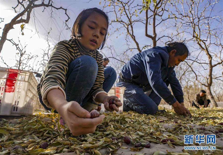 10月20日,在且末縣阿熱勒鎮(zhèn)有機(jī)紅棗園里,一名小朋友在幫家人撿紅棗。