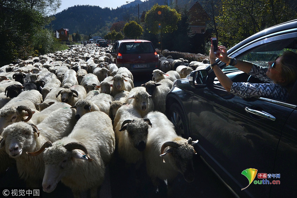 2018年9月27日訊(具體拍攝時間不詳),波蘭,浩浩蕩蕩的綿羊大軍為了趕在冬天之前回到農場過冬,阻斷了鄉(xiāng)村的主車道。