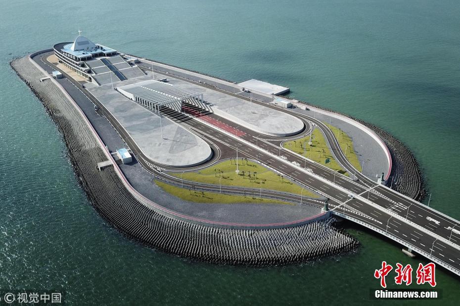 圖為2018年9月18日,強臺風(fēng)“山竹”吹襲香港過后,港珠澳大橋安然無恙。圖為位于香港海域的港珠澳大橋東人工島。李志華 攝 圖片來源:視覺中國