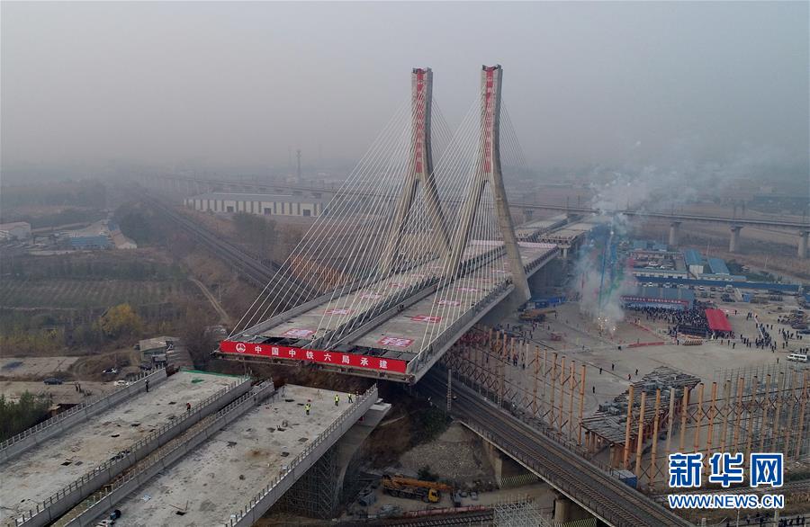 10月25日,唐山市二環(huán)路項(xiàng)目上跨津山鐵路斜拉橋轉(zhuǎn)體成功(無人機(jī)拍攝)。 當(dāng)日,河北省唐山市二環(huán)路項(xiàng)目上跨津山鐵路斜拉橋轉(zhuǎn)體成功。據(jù)介紹,該橋總長927.5米,主橋由斜拉轉(zhuǎn)體橋和轉(zhuǎn)體T構(gòu)橋組成,轉(zhuǎn)體總重5.1萬噸,其中斜拉轉(zhuǎn)體橋重3.3萬噸,主塔高達(dá)80.5米,為曲線變截面“雙人字”形空心塔,自上而下共有128根斜拉索。 新華社記者楊世堯攝