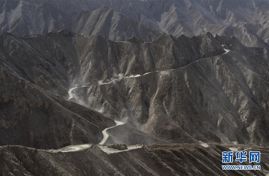 在距離且末縣縣城160多公里的昆侖山上的興發(fā)達(dá)玉礦,可見(jiàn)對(duì)面山上運(yùn)載銅鋅礦礦石的卡車(chē)行駛在簡(jiǎn)易礦山公路上(10月23日攝)。 新華社記者武巍攝
