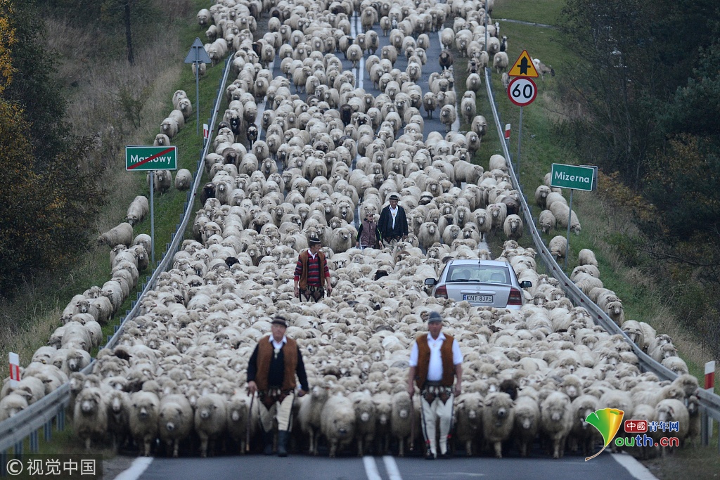 2018年9月27日訊(具體拍攝時間不詳),波蘭,浩浩蕩蕩的綿羊大軍為了趕在冬天之前回到農(nóng)場過冬,阻斷了鄉(xiāng)村的主車道。