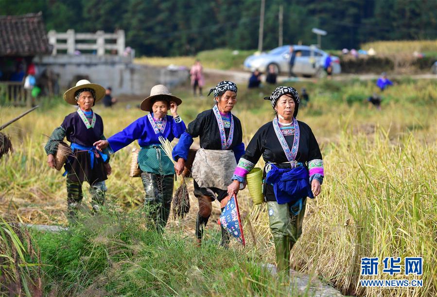 10月30日,在廣西融水苗族自治縣安太鄉(xiāng)元寶村,村民走在田間,準(zhǔn)備收獲香糯。