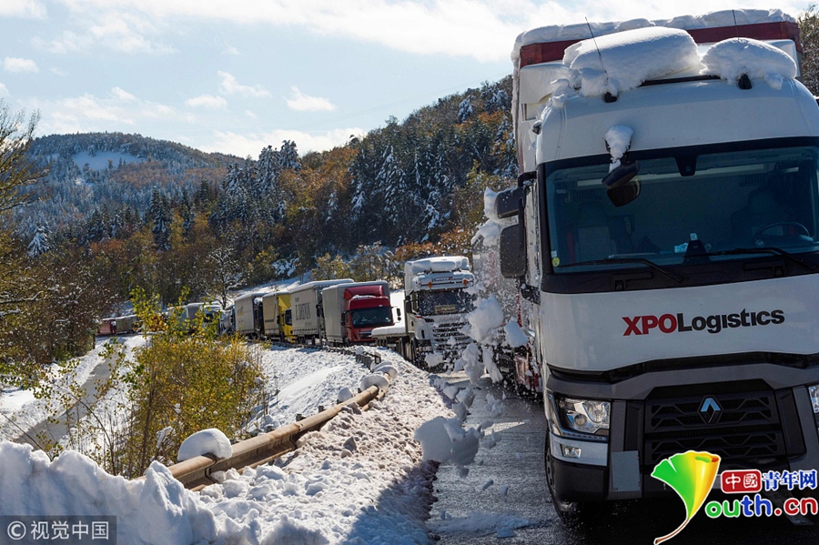 當(dāng)?shù)貢r(shí)間2018年10月30日,法國菲克斯圣熱內(nèi),當(dāng)?shù)赝唤荡笱瑢?dǎo)致950人被困在大雪覆蓋的公路上,不得不睡在緊急救援中心。法國國家氣象局已經(jīng)將當(dāng)?shù)刂糜诔壬踩渲隆?/p>
