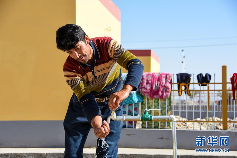 買合肉甫·木拉吧在庭院里洗手。相較于去河里取水,新城里的自來(lái)水大大方便了生活(10月28日攝)。新華社記者 關(guān)俏俏 攝