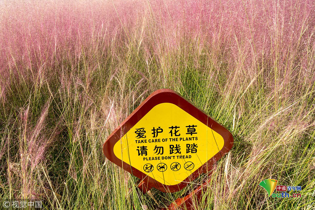 2018年9月28日,上海,東外灘楊浦濱江的粉黛亂子草目前已進(jìn)入盛花期,當(dāng)日早間,不少市民來到濱江拍照賞景,成片的紫色花海在藍(lán)天白云映襯下美不勝收。圖片作者:王岡/視覺中國