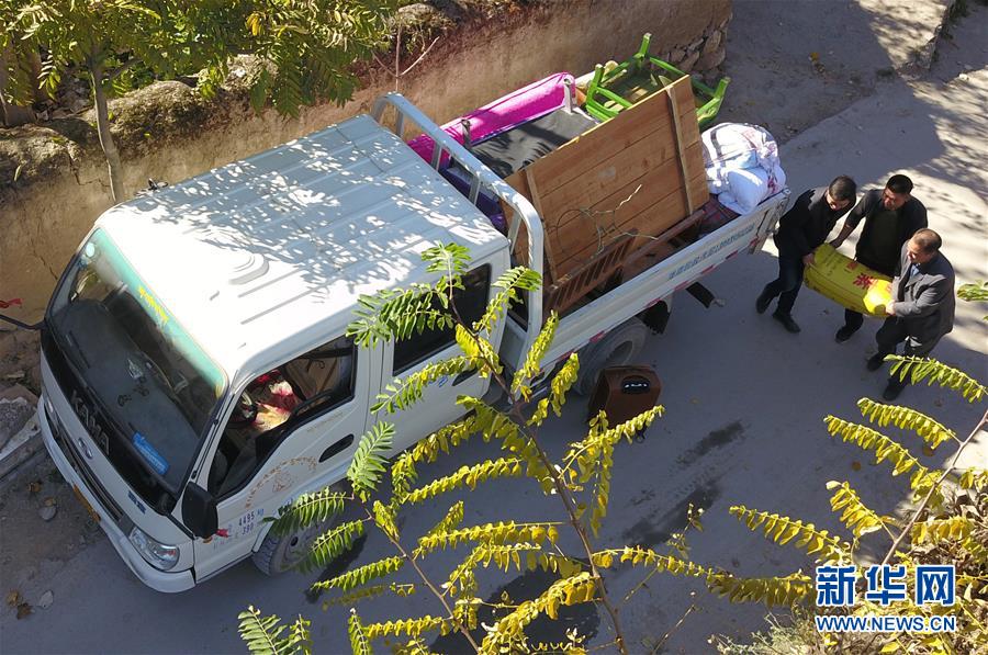 在隴南市武都區(qū)坪埡藏族鄉(xiāng)舊墩村,村民將物品裝車準(zhǔn)備搬遷下山(10月31日無人機(jī)拍攝)。 新華社記者 范培珅攝