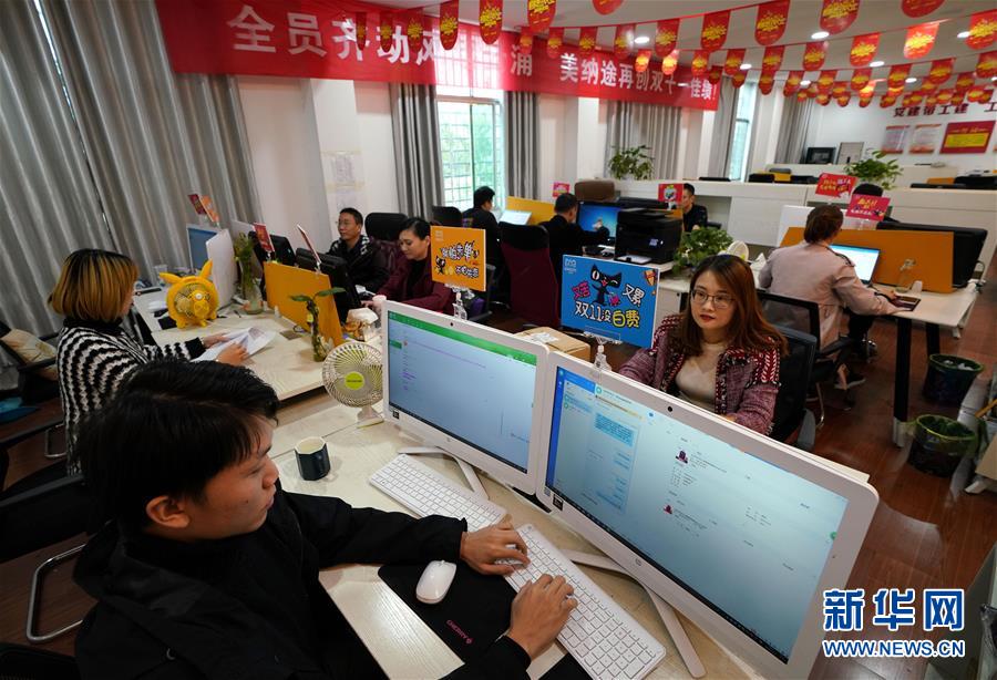 11月3日,貴溪市美納途箱包公司的客服人員在接受客戶咨詢。該公司推出的“雙十一”購(gòu)物節(jié)預(yù)售活動(dòng)已經(jīng)開(kāi)始。新華社記者宋振平攝