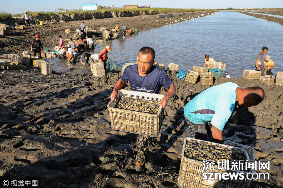 緊挨著黃海的大片養(yǎng)殖區(qū),因為一條濱海大道,被自然劃成南北兩個部分。挖蟶人從四面八方趕來,或集體包車、或自駕摩托。這些機動車密密地??吭跒I海大道一側,綿延數公里。