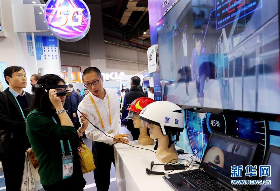 11月5日,一名參觀者(左)在諾基亞展臺體驗一款基于5G通信技術(shù)的AR安防系統(tǒng)終端設(shè)備。 新華社記者 方喆 攝