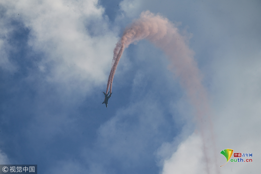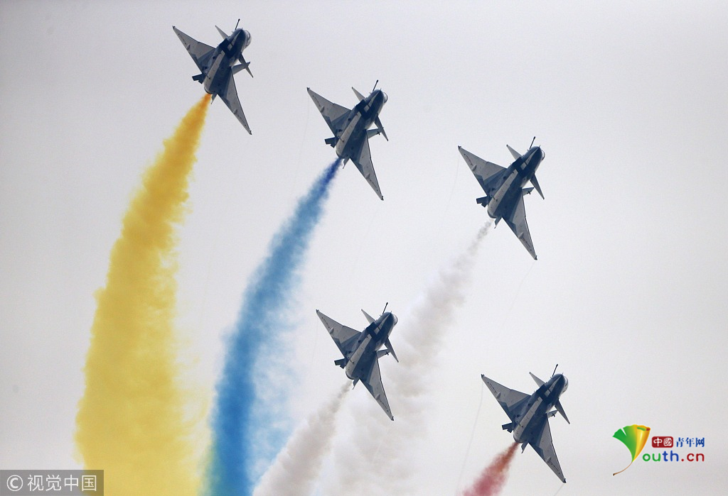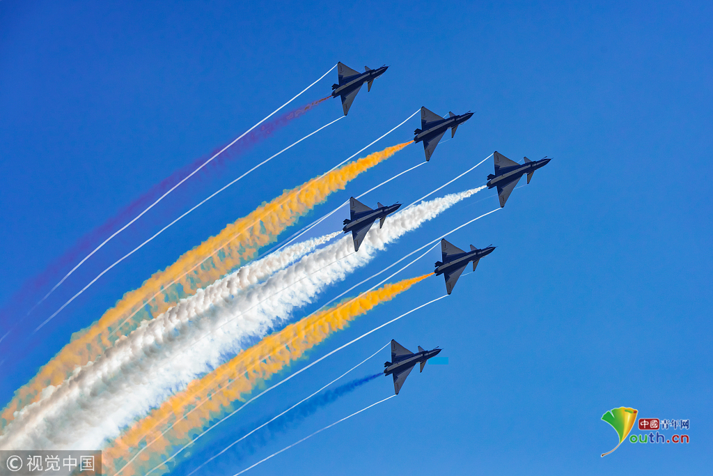 2018年11月8日,廣東珠海,第十二屆中國國際航展第三天??哲姟鞍艘弧憋w行表演隊(duì)的隊(duì)員們,發(fā)揚(yáng)連續(xù)作戰(zhàn)精神,給觀眾們表演了七機(jī)分組開花、四機(jī)編隊(duì)橫滾等高難動作,受到觀眾們的稱贊。視覺中國
