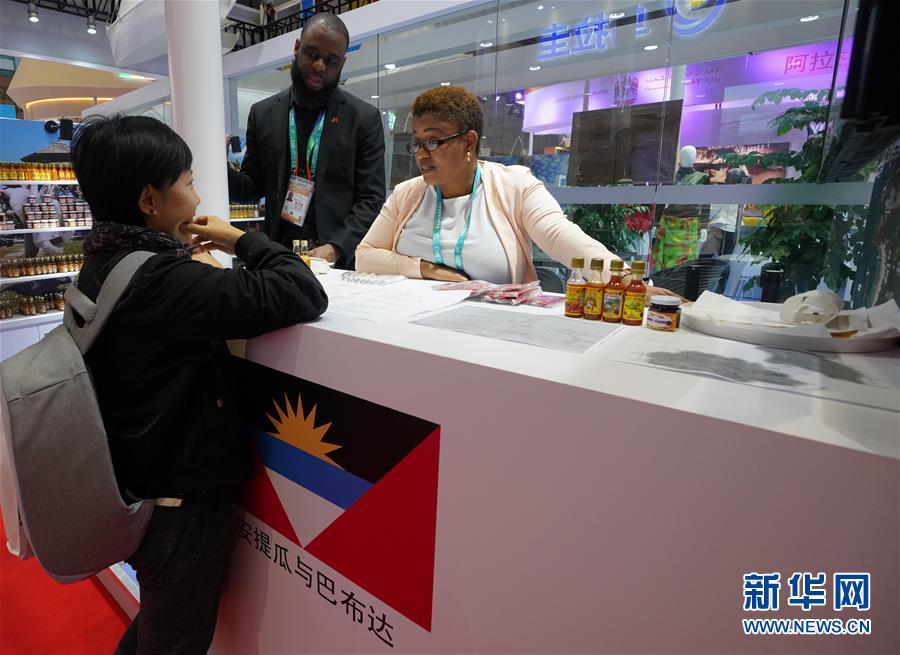 11月8日,在加勒比地區(qū)國(guó)家展區(qū)安提瓜和巴布達(dá)展臺(tái),一名參觀者(左)與工作人員交談。 中國(guó)國(guó)際進(jìn)口博覽會(huì)11月5日在上海開幕。國(guó)家貿(mào)易投資綜合展(國(guó)家展)是中國(guó)國(guó)際進(jìn)口博覽會(huì)的重要內(nèi)容,共有82個(gè)國(guó)家、3個(gè)國(guó)際組織設(shè)立71個(gè)展臺(tái)。 新華社記者 程麗 攝