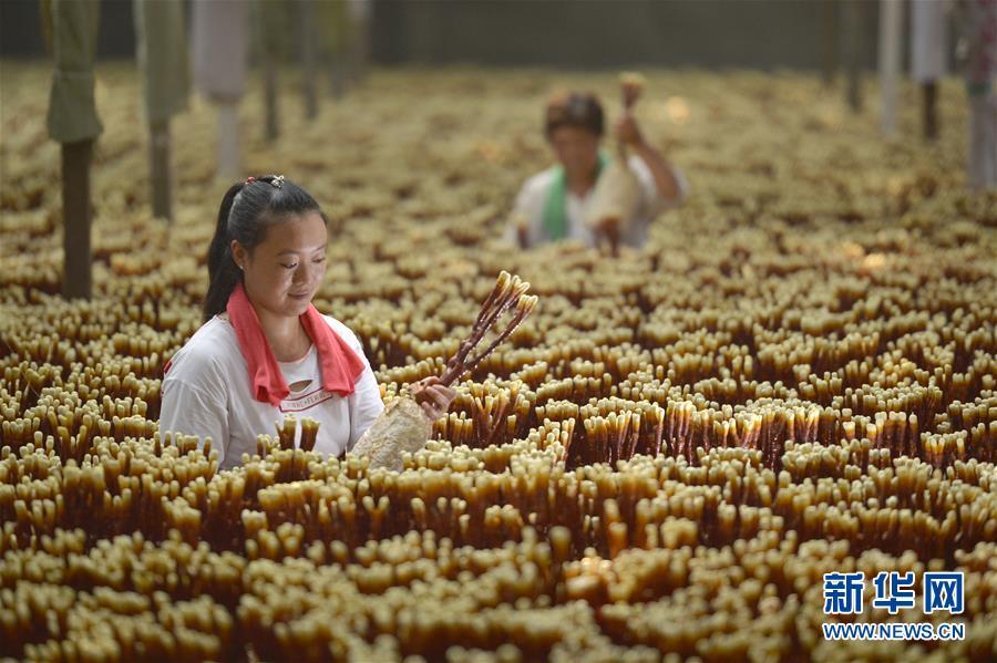 8月22日,河北省沙河市蟬房鄉(xiāng)水磨頭村農(nóng)民在管理種植的靈芝。