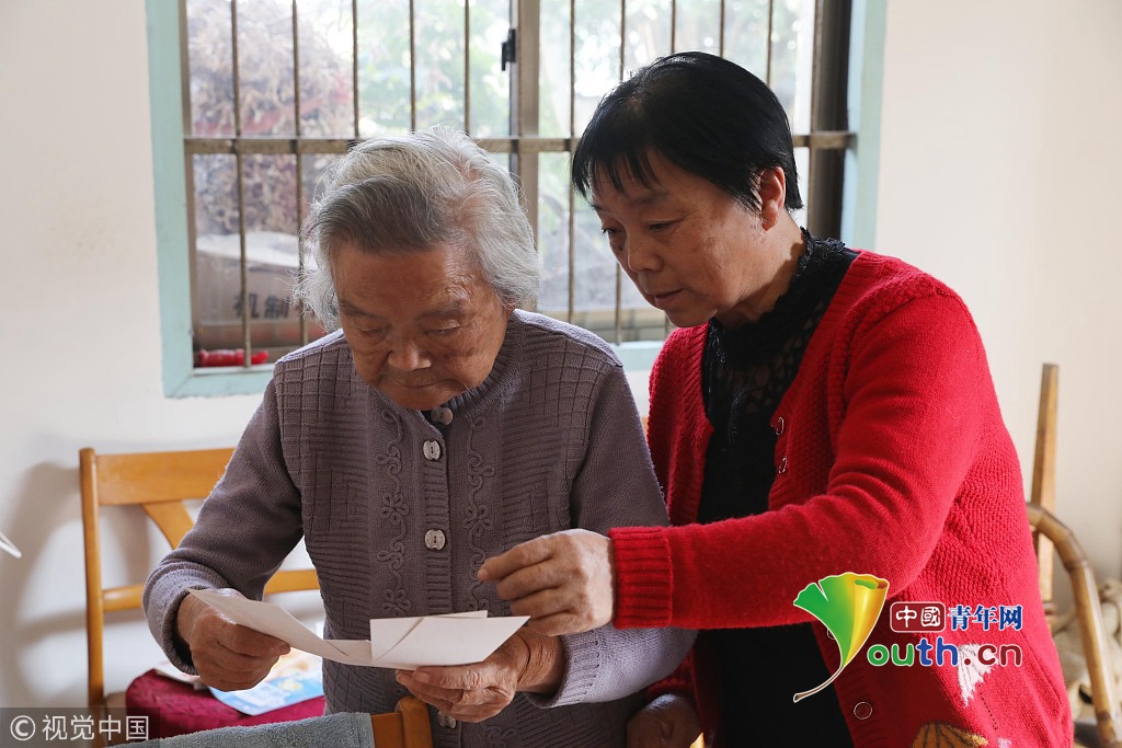 2018年10月31日,杭州,著名作家金庸的妹妹查良琇在浙江臨安家中翻看照片。