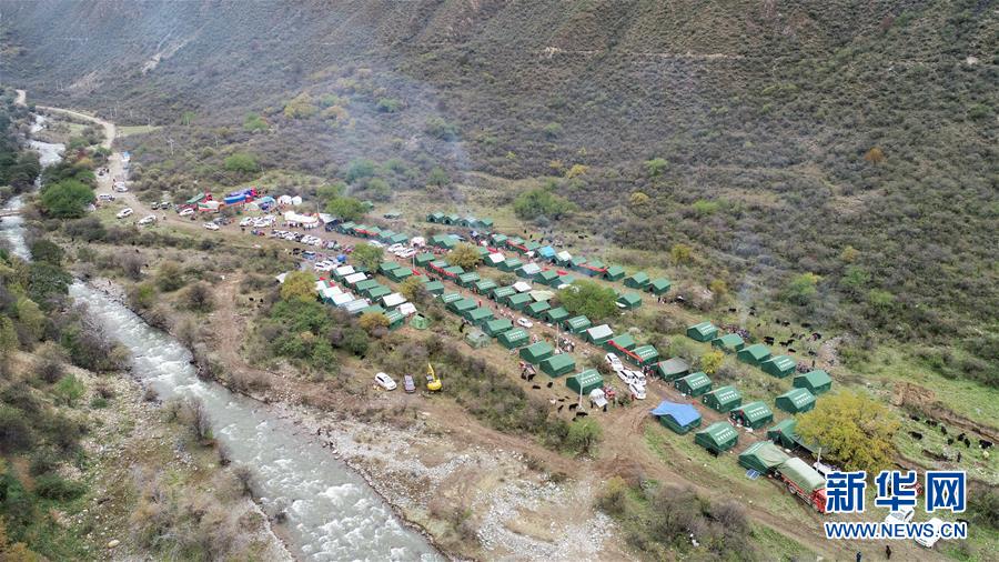 10月19日拍攝的在米林縣派鎮(zhèn)尼定村搭建的安置點(diǎn)。 記者從西藏自治區(qū)林芝加拉村雅魯藏布江堰塞湖災(zāi)情應(yīng)急搶險(xiǎn)工作第二場新聞發(fā)布會上獲悉,19日13時(shí)30分,雅魯藏布江米林縣堰塞體上游水位超過堰塞體,開始自然過流,上游水位正在緩慢下降。目前,各項(xiàng)搶險(xiǎn)救援工作正在有序開展。 新華社記者 覺果 攝