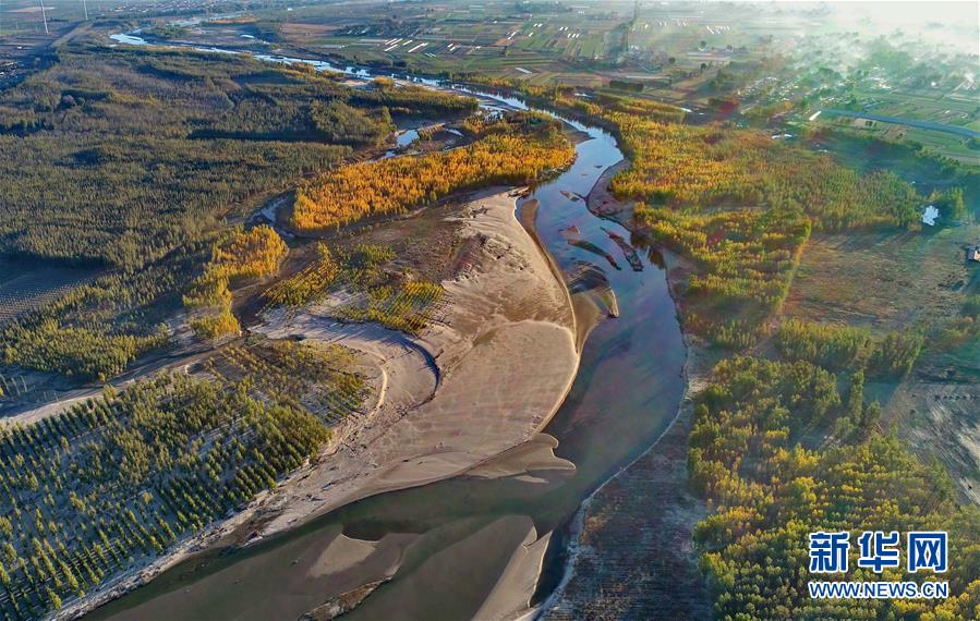 這是河北省樂亭縣境內的灤河秋色(11月6日無人機拍攝)。