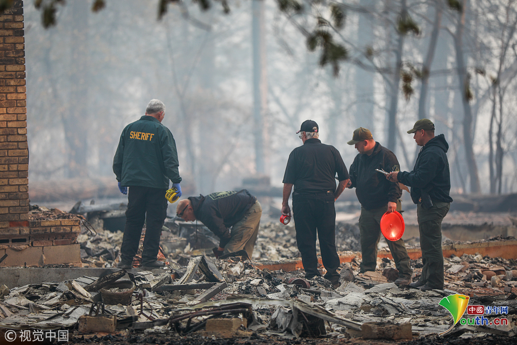 11月13日,在美國(guó)加利福尼亞州天堂鎮(zhèn),搜救人員在山火過(guò)后的廢墟工作。