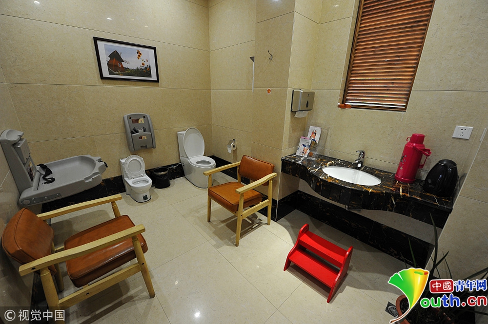“第5空間”男女廁所的廁標(biāo)別具特色,選用京劇臉譜的形式,讓人充滿了新奇感。公廁內(nèi)設(shè)有母嬰室,里面安裝了各類為帶嬰兒的媽媽們上廁所提供便利的設(shè)施,除洗手池和供兒童、成人專用坐便器外,還有折疊式的嬰兒座椅和護(hù)理臺,這樣帶嬰兒的媽媽進(jìn)來如廁,就可以把孩子安全地放在椅子上;如果孩子需要換尿布,也可以在護(hù)理臺上完成?! ?/p>