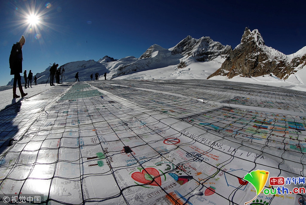 當?shù)貢r間11月16日,瑞士阿爾卑斯山“少女峰”上展示的十萬多張明信片,呼吁關注氣候變暖。這些明信片是由世界各地的人們寄來的,打破了世界上最大明信片的吉尼斯世界記錄。