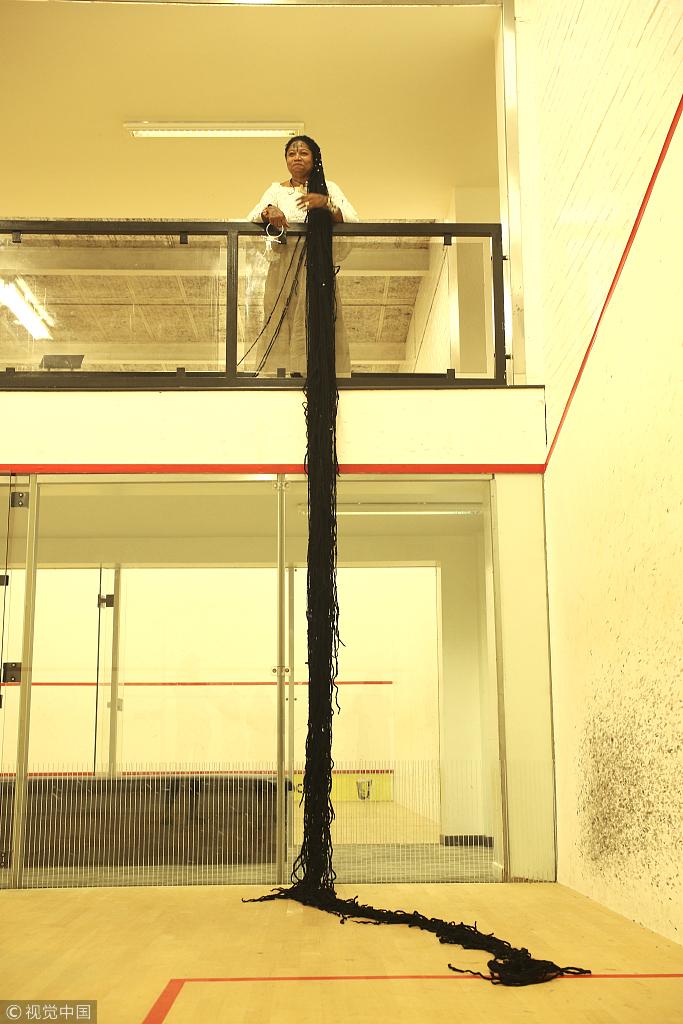 當?shù)貢r間2018年9月14日,英國韋靈伯勒,正在英國旅行的Asha Mandela來自美國佛羅里達州,是世界上頭發(fā)最長的女人。