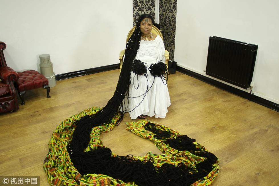 當?shù)貢r間2018年9月14日,英國韋靈伯勒,正在英國旅行的Asha Mandela來自美國佛羅里達州,是世界上頭發(fā)最長的女人。她的頭發(fā)現(xiàn)在長約34米(110英尺),超過三輛雙層巴士的長度。Asha Mandela十年前打破了世界吉尼斯頭發(fā)最長的紀錄。